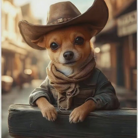 Howdy aus der Westernstadt: Dieses Motiv zeigt einen kleinen Hund im detailreichen Cowboy-Outfit – mit großem Hut, Lederjacke, Halstuch und Handschuhen. Im Hintergrund erstreckt sich eine staubige Straße einer alten Westernstadt mit Schildern, Holzfassaden und weichem Sonnenlicht.